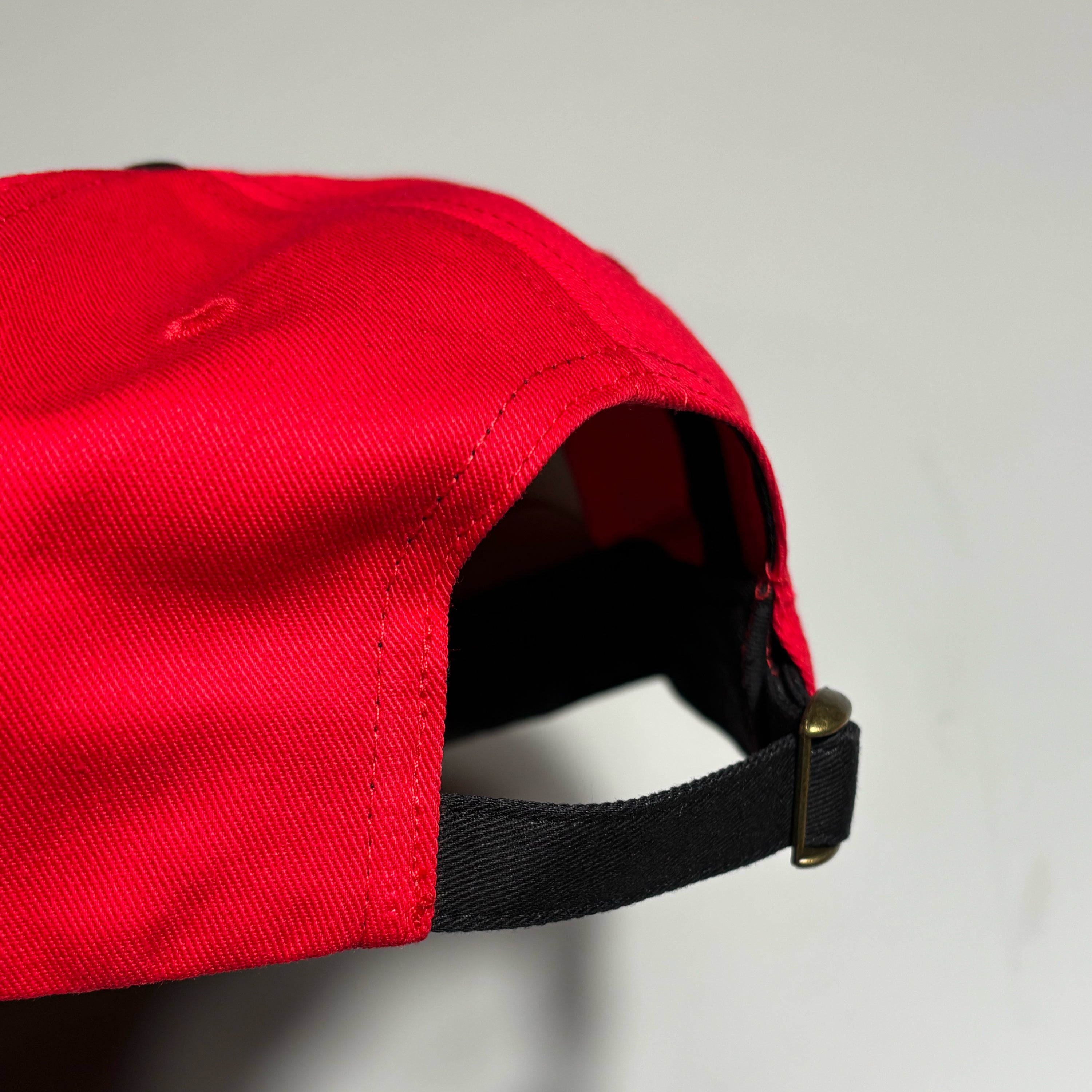RED/BLACK TWILL HAT WITH EMBROIDERED ART ON CROWN.