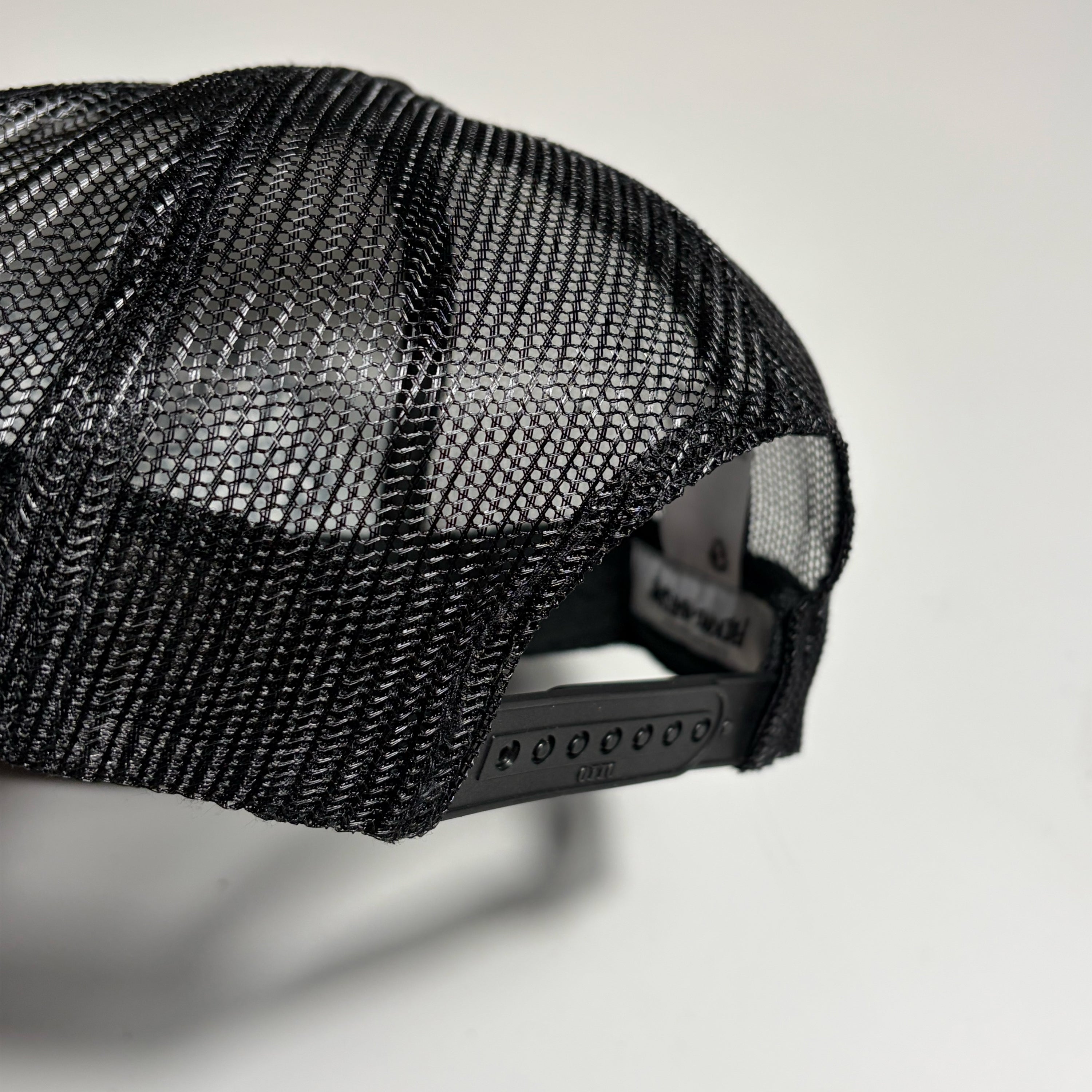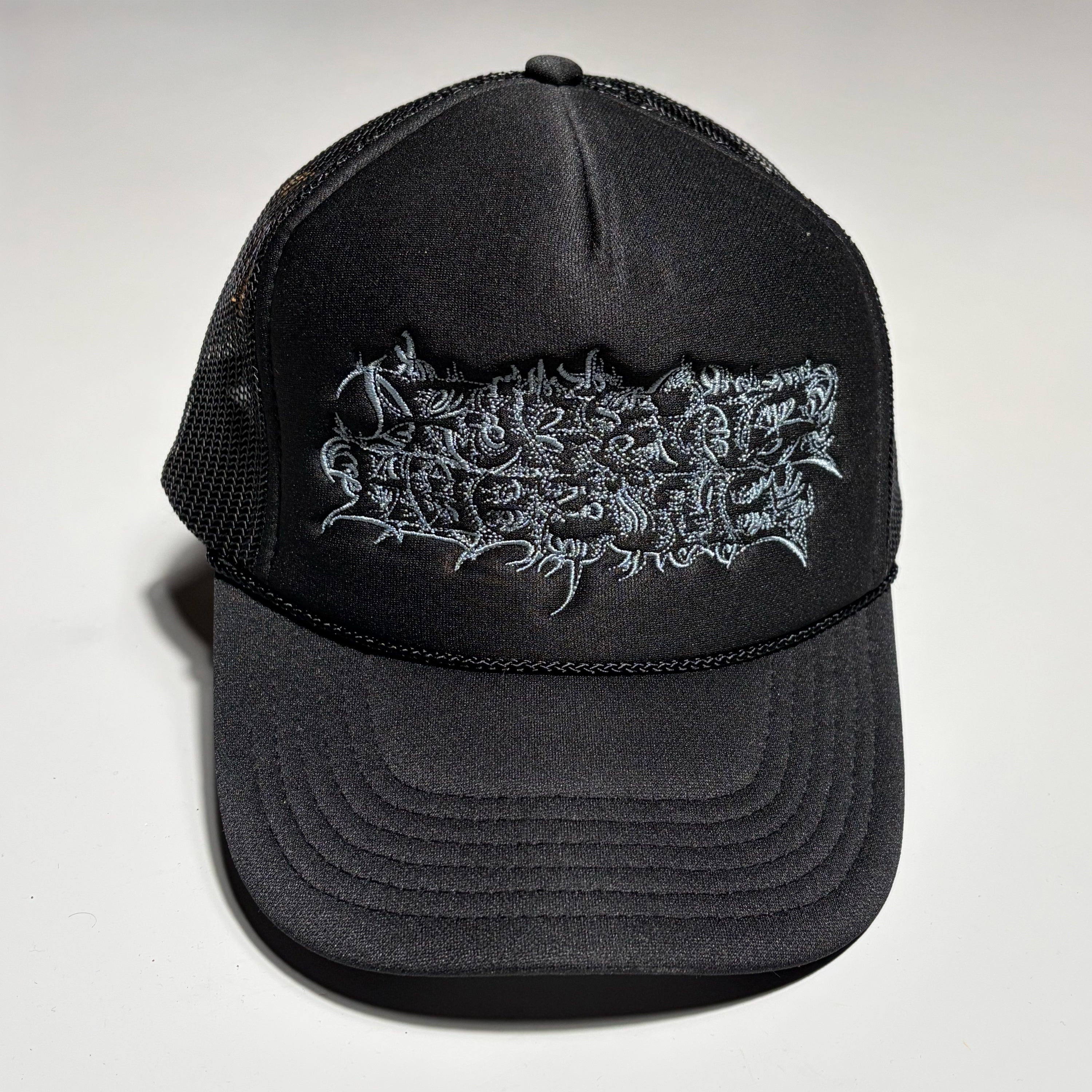 BLACK FOAM/MESH WITH EMBROIDERED ART BY SAVIE ON CROWN.